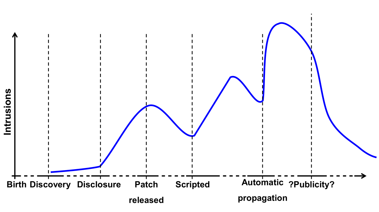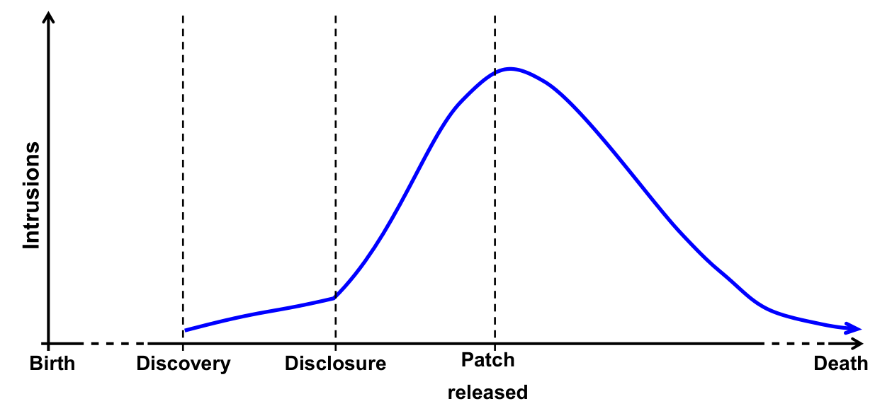 Intrusions increase once users discover a vulnerability, and the rate continues to increase until the vendor releases (and system administrators install) a patch or workaround.