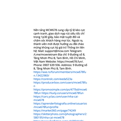 Website: https://mcw678.fun/https://mcw678.fun/ Nhà cái MCW678 cung cấp odds hấp dẫn, thanh toán cực nhanh trong thời gian ngắn, bảo vệ thông tin cao cùng với CSKH 24/7. Đặc biệt, người chơi mới nhận liền bonus chào mừng cực lớn giá trị cao! Thông tin liên hệ: Mail: s