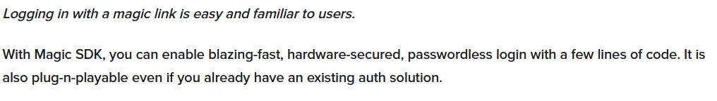 Magic is a developer SDK that you can integrate into your application to enable passwordless authentication using magic links - similar to Slack and Medium.