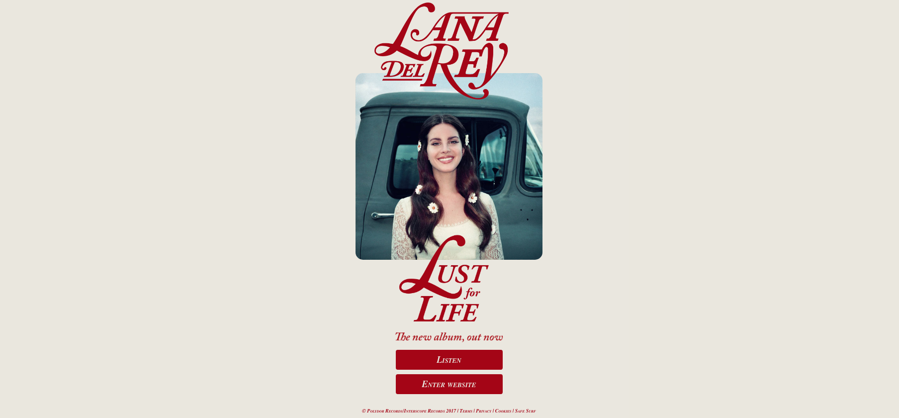 Lana Del Rey has also recently released new music. This first page of her website immediately advertises her new album, 'Lust For Life'.