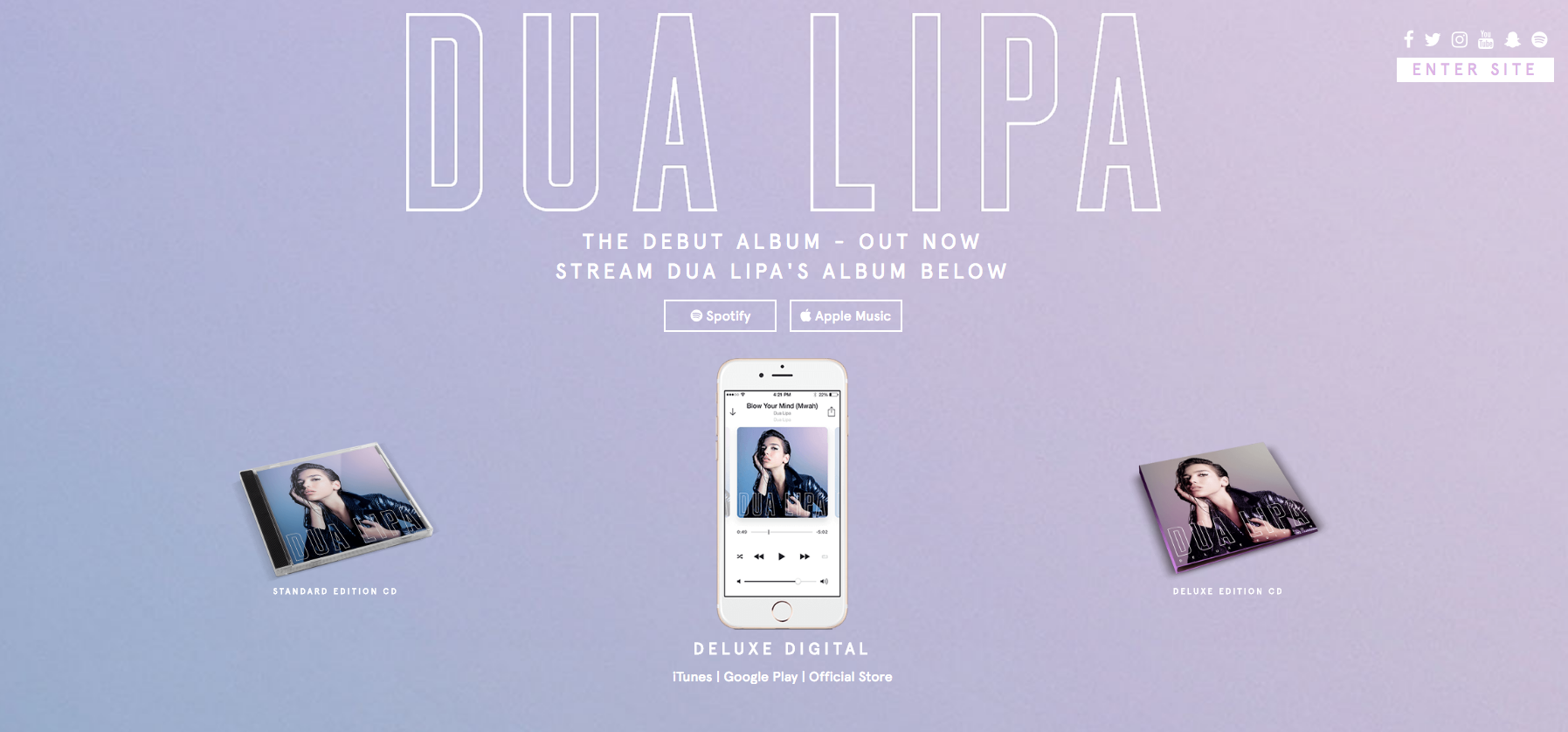 From this analysis of Lipa's 'enter' page, you are able to see how this part of her website has been used to its maximum. This is the first page that the audience is taken to when they click on the link for Lipa's website, meaning that as soon as they click on her website, her debut album is immediately marketed to them in all of its different forms, from physical CDs to digital downloads as well as online streaming. This demonstrates how the use of this particular page heavily emphasises Lipa's marketing campaign.