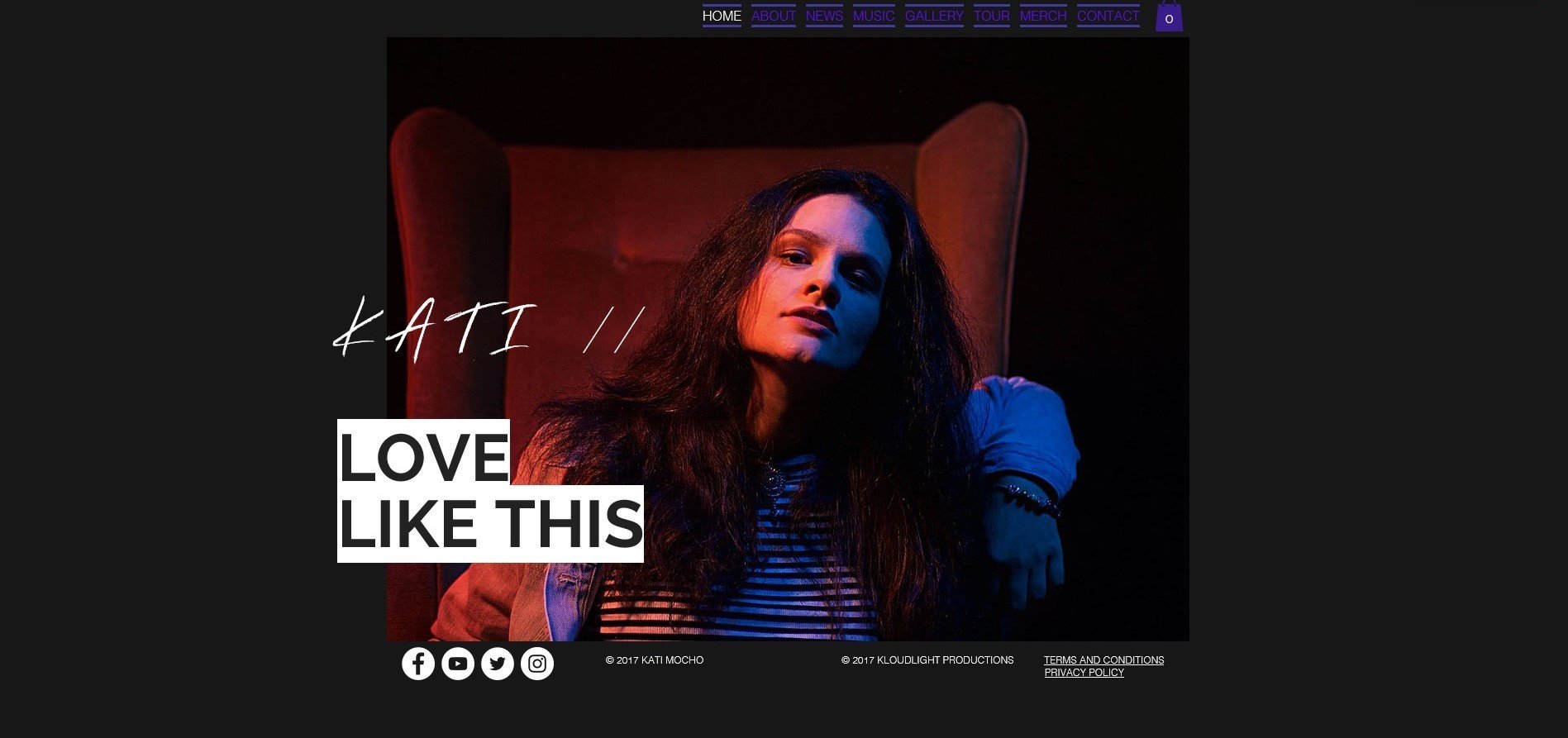For this page we decided to use a large photo of Kati, representing her to her audience from the very beginning of her website. This immediately shows our audience who our artist is and gives a clear representation of her as being feminine but also somewhat bold and lively. She comes across as bold through the way how she slightly tips her head up towards the camera, suggesting that she is the one who is in control, and the lighting used for this shot gives it colours of reds and blues, with these bright colours representing her as lively. Whilst this gives a positive representation of a female pop artist for her predominantly young female audience, she also appears to be rather feminine as well, further attracting our audience, through her make-up, jewellery and outfit which includes a crop top and denim jacket which is a rather mainstream and popular fashion amongst Kati's predominantly teenage audience.