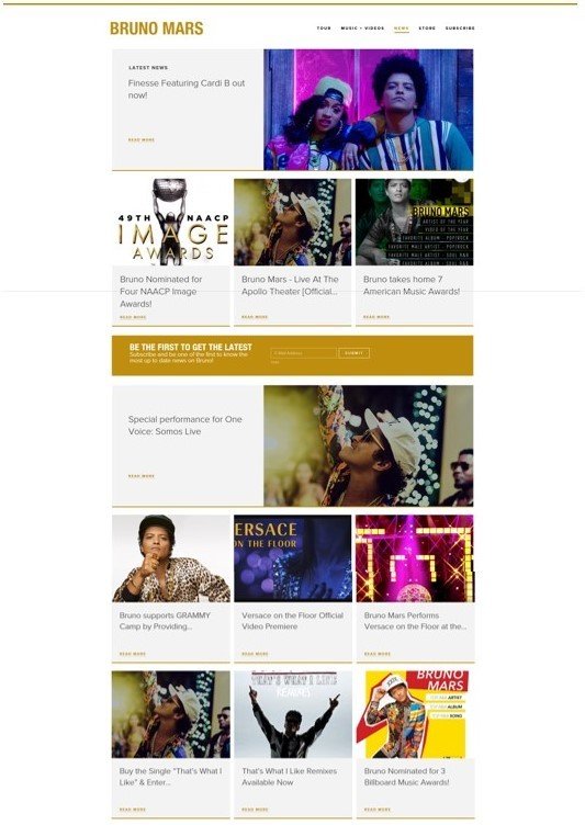 From the examples given on the previous slide, you are able to see how these 'news' pages provide the audience with a range of information, including extra-curricular activities that the artist is involved in as well as other marketing campaigns, further advertising them. However, they mainly include advertisements for new singles, EPs or albums that the artist has recently released alongside any new merchandise which relates to these new products.