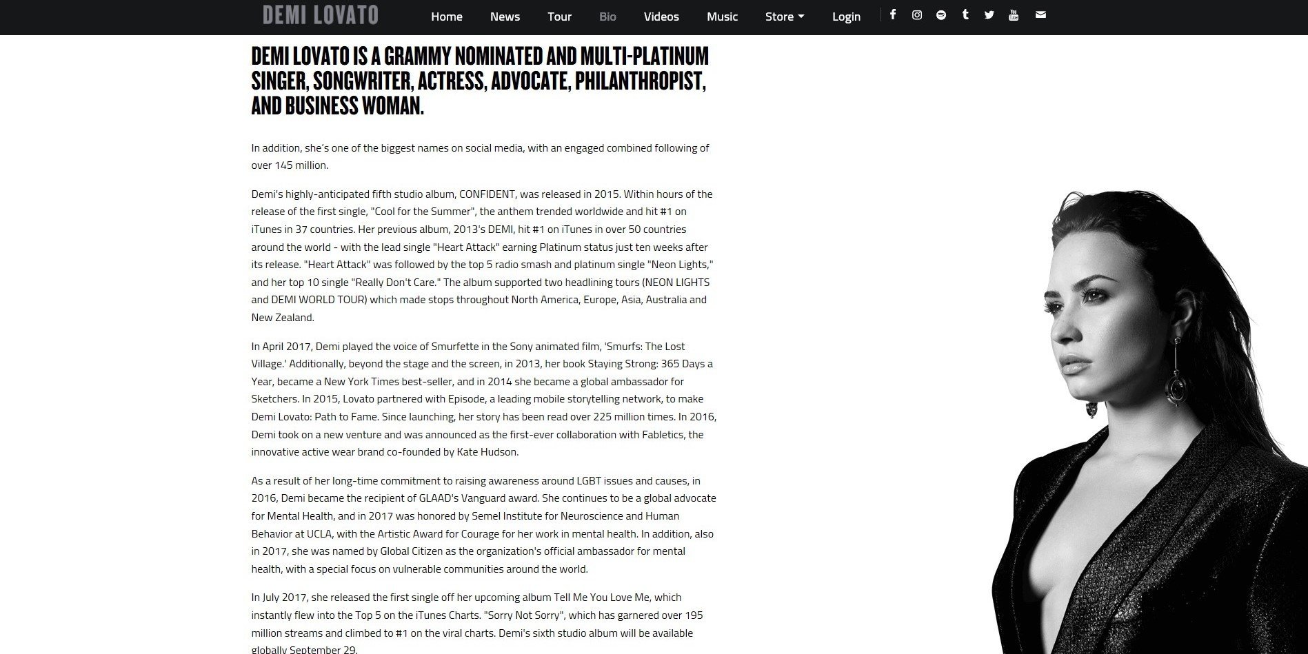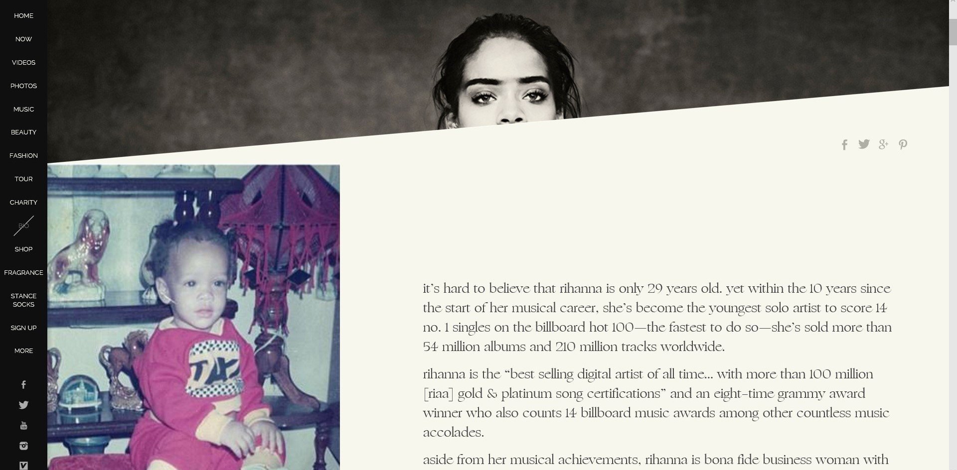 From the examples on the previous slide, you can see how many websites for music artists do not actually include personal information about the artists' background. Although this is rather common, not all artists exclude this information from their website. For example Demi Lovato and Rihanna's website both include a 'bio' page, discussing the artists' personal life and background and how far they have come as a singer from the start of their career: