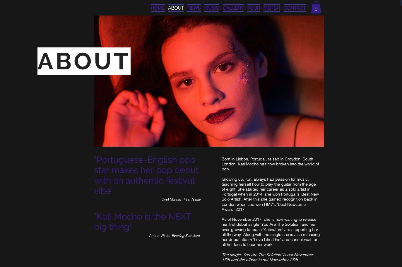 Perhaps somewhat dissimilar to Dua Lipa's 'enter' page for her website, for this page of our website we decided to make it relatively simplistic, focusing more on the aesthetic and style of the page rather than its contents. We chose to do this because we had the rest of our website to include all of the different contents that we wanted to, and by having this simpler style for our 'enter' page, it makes it more stylish and affective, enabling the audience to completely focus on our artist, Kati, and her debut single 'You Are The Solution'. Both of these are clearly advertised on this part of our website, with capital letters and bold fonts. The way how this page of our website is simpler than those of other websites, this shows how we have developed this convention. However, we have still used basic aspects of this convention through the way how we use this page to advertise our artist's debut single.