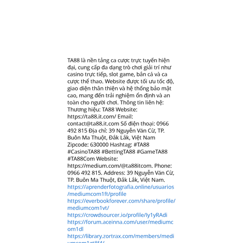 Website: https://medium.com/@ta88itcomhttps://medium.com/@ta88itcom TA88 là nền tảng ca cược trực tuyến hiện đại, cung cấp đa dạng trò chơi giải trí như casino trực tiếp, slot game, bắn cá và ca cược thể thao. Website được tối ưu tốc độ, giao diện thân thiện và hệ thống bảo mật