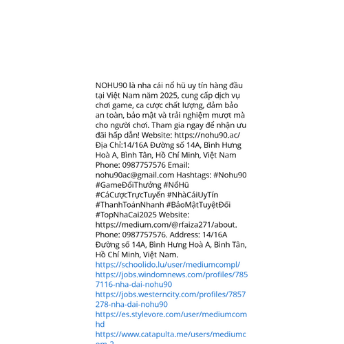 Website: https://medium.com/@rfaiza271/about. NOHU90 là nha cái nổ hũ uy tín hàng đầu tại Việt Nam năm 2025, cung cấp dịch vụ chơi game, ca cược chất lượng, đảm bảo an toàn, bảo mật và trải nghiệm mượt mà cho người chơi. Tham gia ngay để nhận ưu đãi