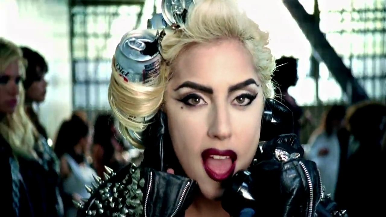 It then cuts to a two shot of a woman with manly features for example the short hair and broad shoulders; she is seen kissing Lady Gaga, openly in front of the other cellmates, which is subverting the female stereotype as women are normally seen with men only; another point is that the camera cut to a close-up shot of Lady Gaga stealing the lesbian’s phone, so she is just potentially using her, which again challenges the female stereotype as it is normally the men who are using the women. In this case her behaviour in the prison is conforming to the social norms of one man and one woman together, by having a woman take the gender role of a man. The camera then cuts to a long shot of all the females in a cell, when a fight breaks out, zooming into them, and cutting to the rest of the woman’s reactions, which are encouraging them to fight, which subverts the female stereotype as they are normally not seen as rebellious characters who would be involved in violence; they are also portraying the male stereotype with the aggressive manner of cheering them on. The camera then cuts to a mid-shot of Lady Gaga answering the phone, now starting the actual song; she is wearing a studded black leather jacket, with a matching bra and knickers; she also has coke cans as rollers in her hair, she is wearing dark make-up (red lipstick and black eye-liner)- her whole appearance is challenging the female stereotype, as she is portraying a ‘bad girl’ character, which is not the typical stereotype, as females are normally seen as girly, and shy.