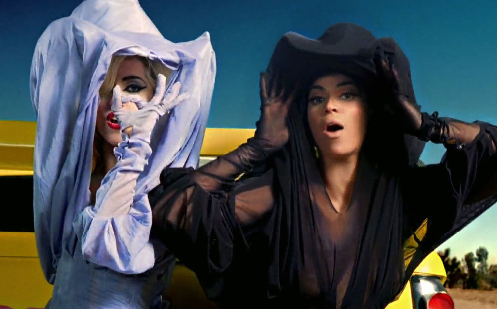 The camera is then cut to a mid-shot, of Lady Gaga, and Beyoncé dancing in the dinner; again challenging the stereotype as they are almost celebrating their successful homicide. The shot is then cut to a television report about this, and then cut to the car driving off. There were many intertextual references, for example the car that they were driving in was called ‘pussy wagon’- it was the same car in the film ‘Kill Bill’. The uniform that Lady Gaga was wearing was also similar to the nurse in Kill Bill, with the eye patch; Gaga too covered her eye and they both were holding poison. Another reference was ‘Pulp fiction’ when Gaga called Beyoncé ‘honey bee’, which was a similar nickname used by one of the robbers in the famous scene, in the same looking diner. And last but not least ‘Thelma & Louise’, as they were seen driving off after a successful homicide, which Lady Gaga and Beyoncé did. All references subvert the female stereotype, as these are quite violent films with female protagonists, therefore dominating the spotlight instead of men; especially how it started off with girl power, being in a female prison, they were the superior gender group.