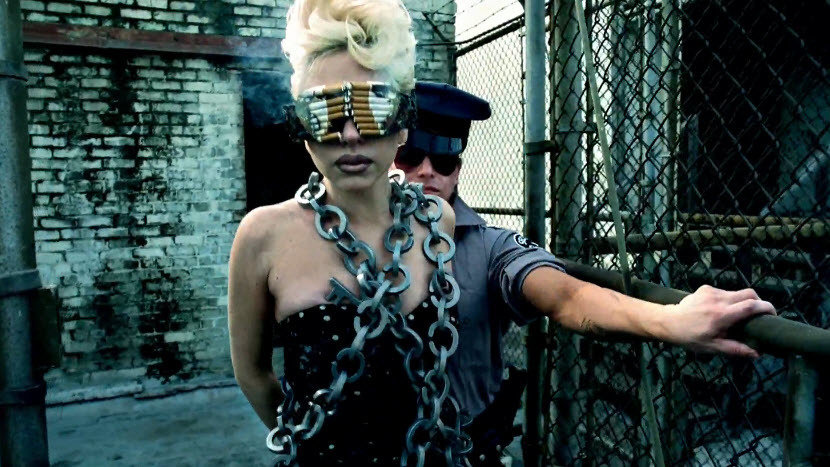 It is then cut to an action match-up shot, where we see Lady Gaga entering the outdoor recreation area, wearing a black corset-like costume, white heels and a huge metal chain with a key, she is also wearing cigarette lit glasses; maybe symbolising power and money, therefore subverting the female stereotype, as she is seen as someone who is dominant- she also walks with her shoulders back and head held high like she ‘owns the place’.
