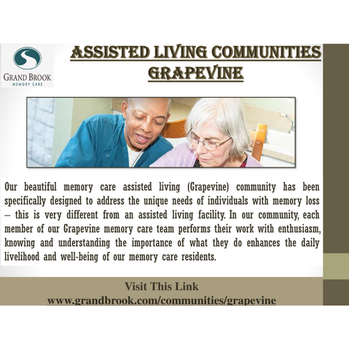 Memory Care Grapevine Provides the highest level of care to individuals with disability at https://grandbrook.com/communities/grapevine/ Find us here: https://goo.gl/maps/xnXo3b3XggQWWbLx6 Services: Assisted Living Grapevine, Memory Care Grapevine, Assisted Living Grapevine Tx, Memory Care Grapevine Tx, Assisted Living Facilities Grapevine, Assisted Living Communities Grapevine, Memory Care Facilities Grapevine Assisted Living Grapevine Tx promote independence, which is healthy for a person's self-confidence. While looking for an assisted-living facility, one should consider what would be best for their particular circumstances.Assisted living facilities are not medical facilities and so do not have a doctor or nurse on staff. Another factor that distinguishes assisted living facilities from nursing homes is the flexibility of location. For most people, cost and location are the number one deciding factors. Talk to a specialist today to learn more about your options! Contact Us: Grand Brook Memory Care of Richardson/N. Garland 2501 Heritage Avenue Grapevine, TX 76051 , USA Phone number - (817) 329-8500 Email : AAnderson@grandbrook.com Social: https://twitter.com/memorycaregrape https://www.instagram.com/memorycaregrapevine/ http://uid.me/memorycaregrapevine https://refind.com/memory-care-mckinney-tx https://medium.com/@grandbrookmemorycare1