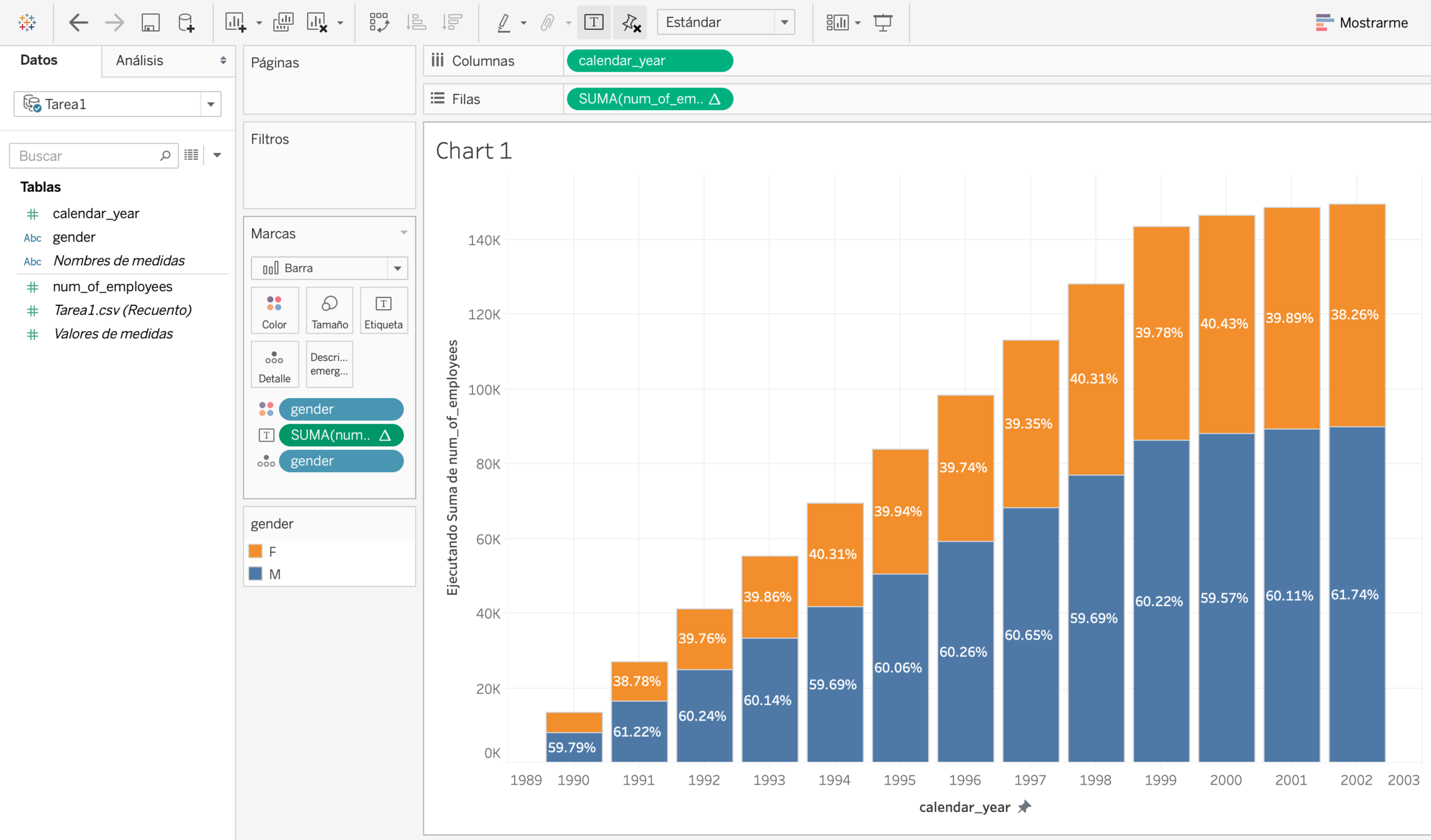 Crear una visualización que proporcione un desglose de los empleados masculinos y femeninos que trabajan en la empresa cada año, a partir de 1990.