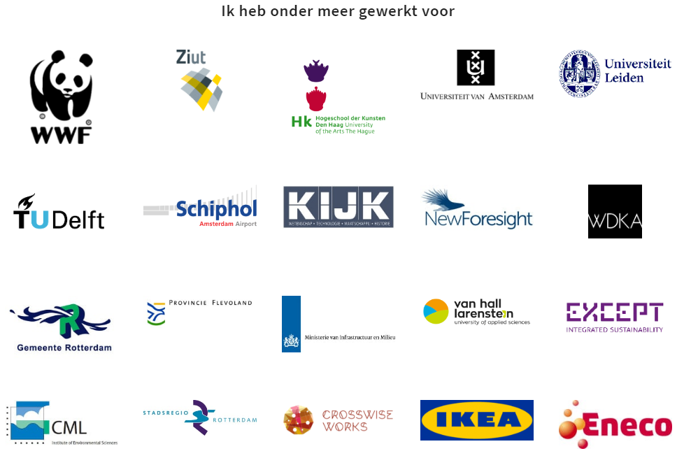 Diverse opdrachtgevers, waaronder Except Integrated Sustainability, kunstacademies, universiteiten