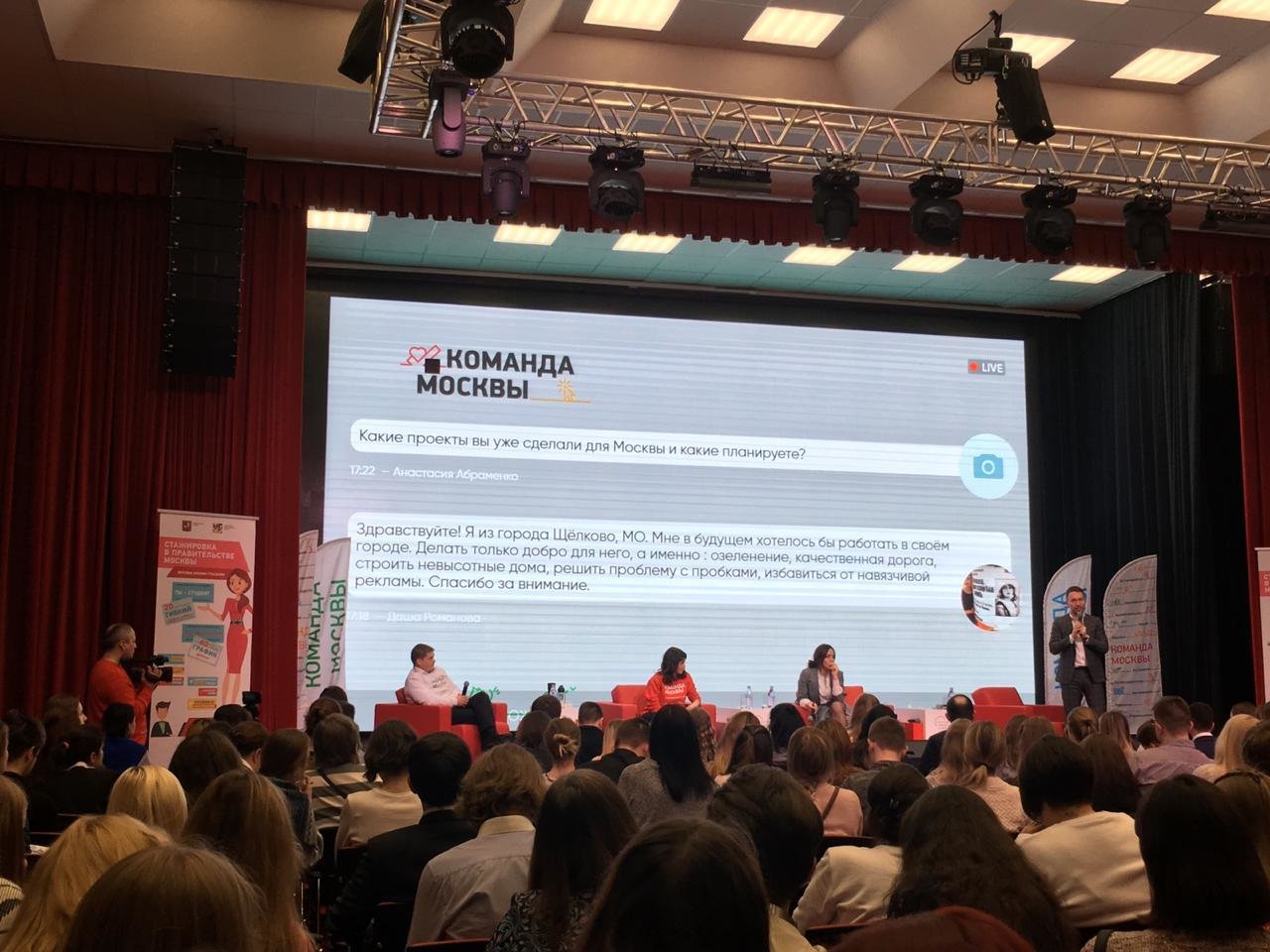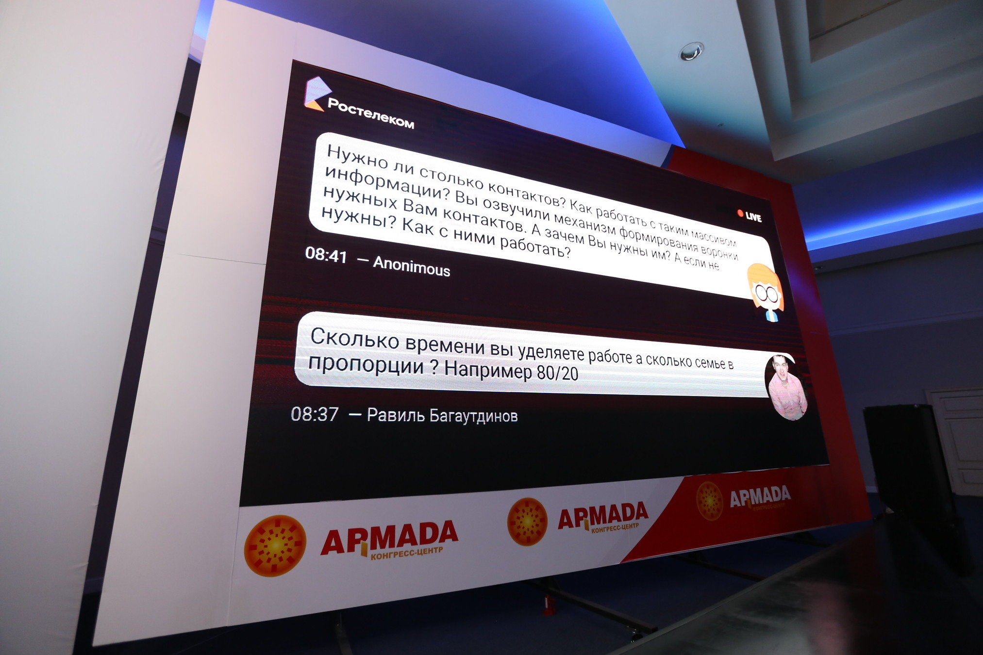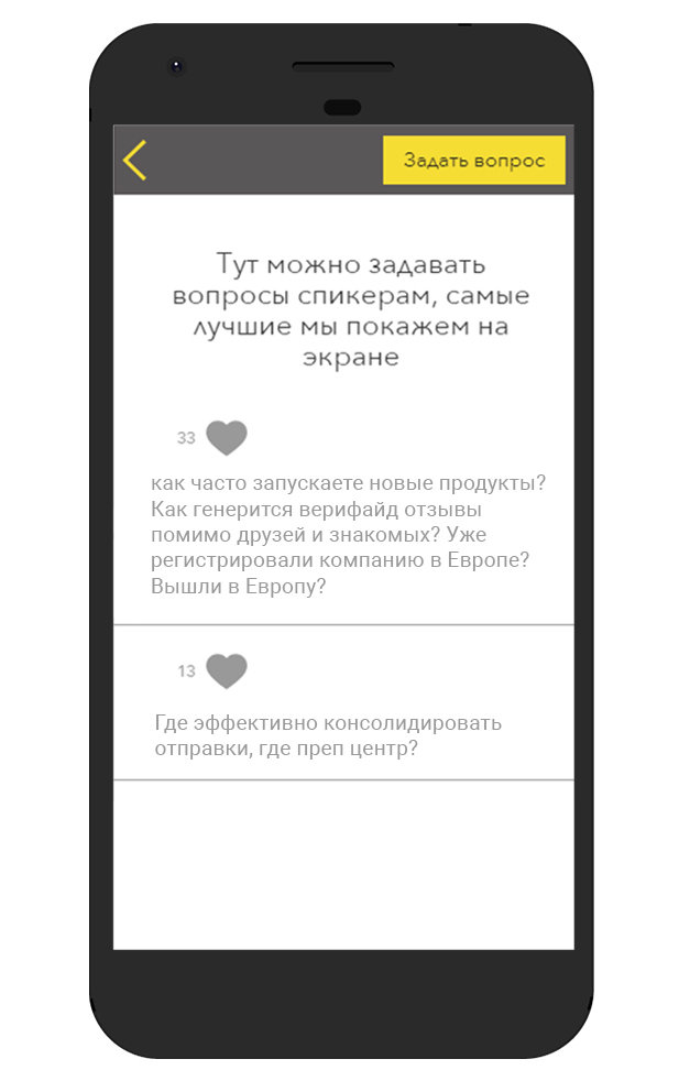 на экраны (модерируются). Лайки за вопросы (опционально)
