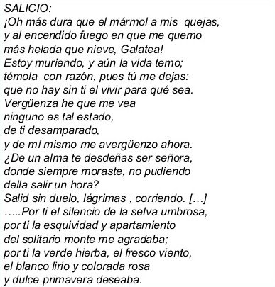 - Salicio está enamorado de Galatea pero ésta le rechaza. Nemoroso llora la muerte de su amada Elisa.