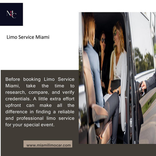 Before booking Limo Service Miami, take the time to research, compare, and verify credentials. A little extra effort upfront can make all the difference in finding a reliable and professional limo service for your special event. Official Website: https://www.miamilimocar.com/ Find Us On Google Maps:https://maps.app.goo.gl/Pso56QPoDRzJAx1R6 Miami Limo Car Address: 2301 Collins Ave, Miami Beach, FL 33139, United States Phone: +13056996919 Our Profile: https://slides.com/miamilimocar Next Slide: https://tinyurl.com/2cly3loa