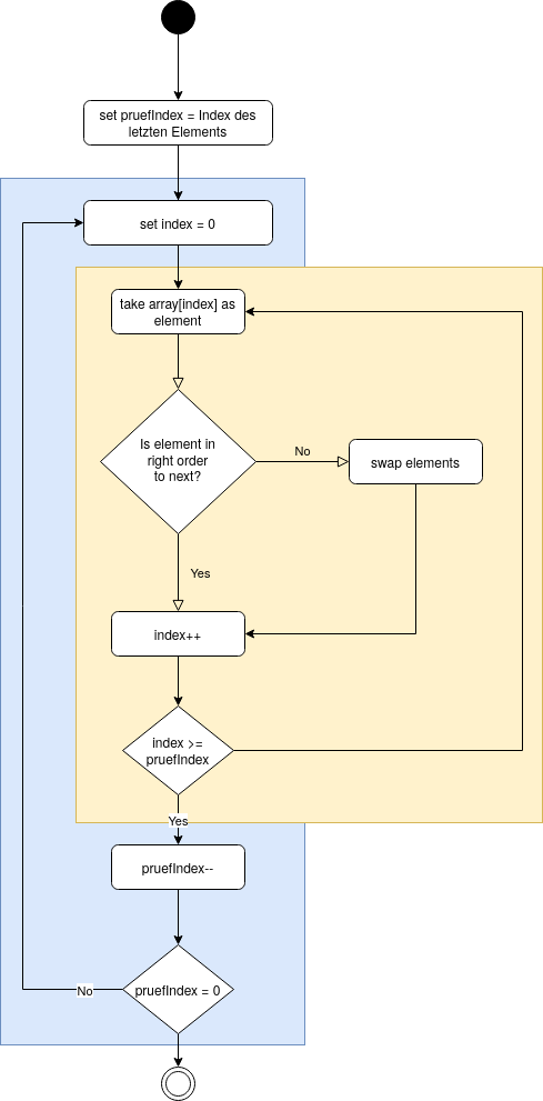 Der BubbleSort sorgt im gelben Loop dafür, dass das größte Element ans Ende kommt.