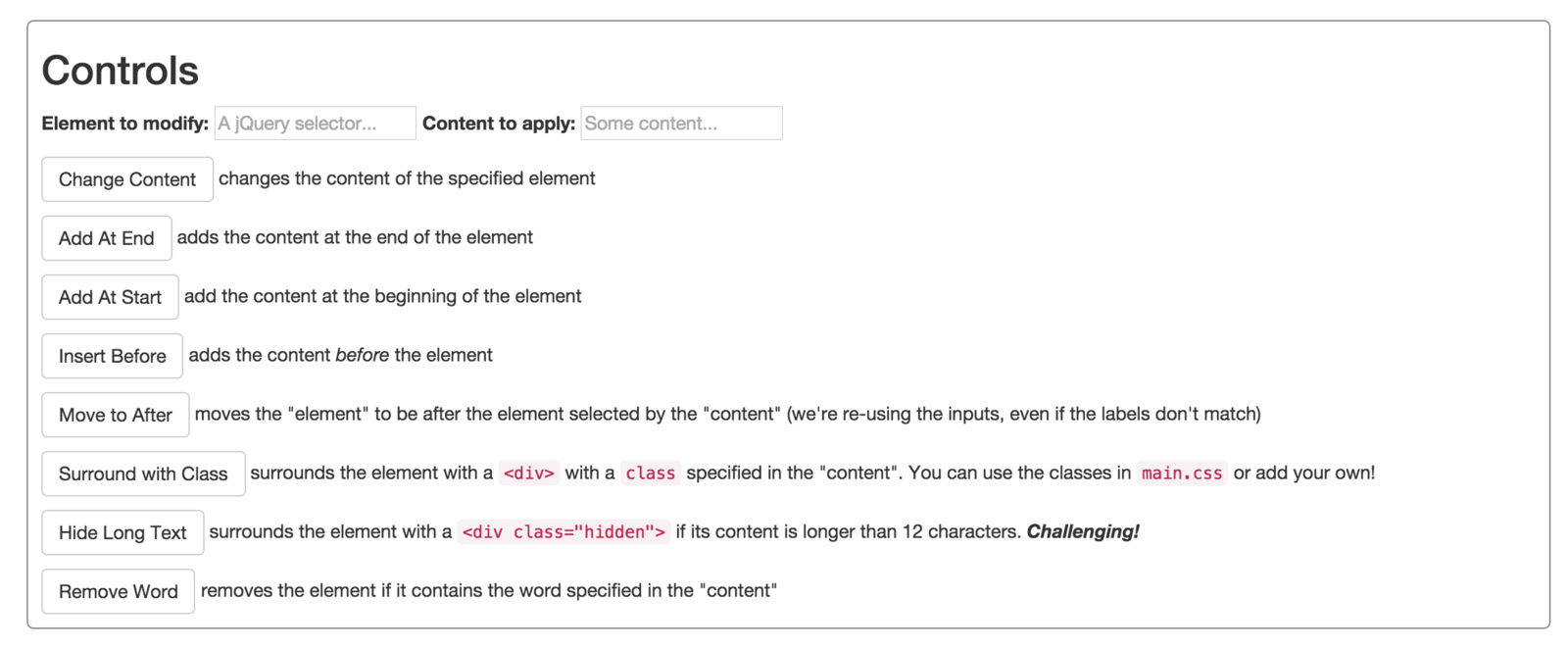 // Select element from the DOM $('selector'); // Assign event $('selector').on('specify-event', function(){}); // Create HTML element var li = $('<li>'); // Add to page $('ol').append(li); // Or li.appendTo($('ol'));