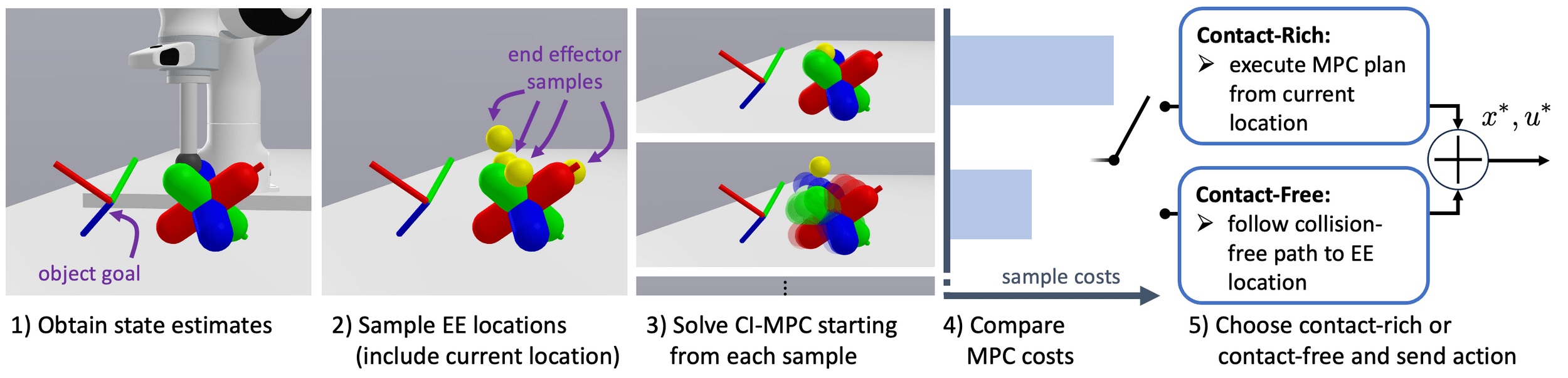 [Venkatesh*, Bianchini*, Aydinoglu, Yang, and P. Approximately Global Contact-Implicit MPC via Sampling and Local Complementarity. Under review.]