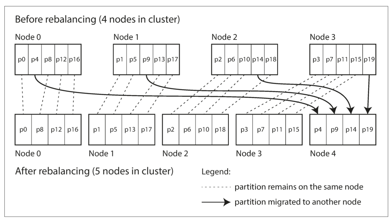 fixed number of partitions per node (consistent hashing)