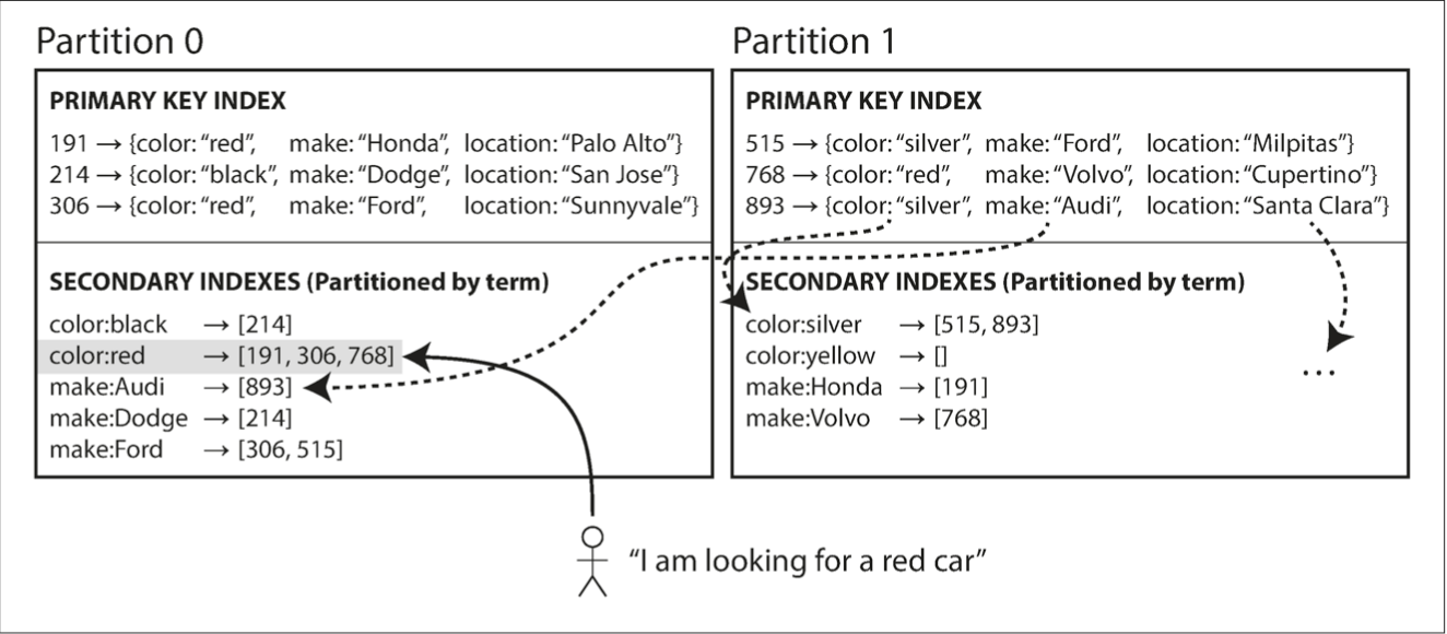 secondary index is also partitioned by its value (term comes from full-text indexes, where the terms are all the words that occur in a document