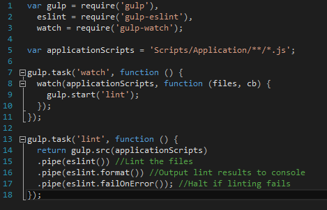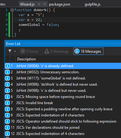 Now, whenever I save a file, gulp runs my unit tests and linting tools. Notice below that Wizard.js failed linting on Save.