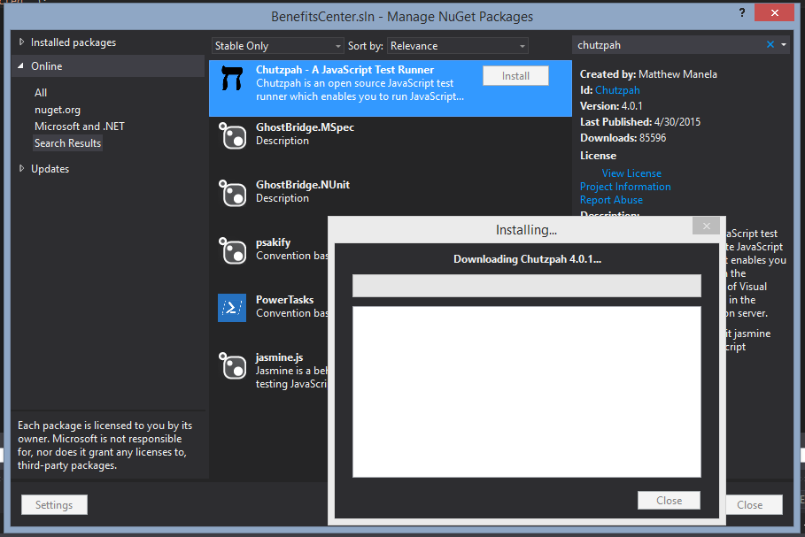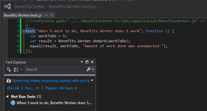 After that, add your test framework and your unit tests. Use <reference> tags to tell Chutzpah to bring in dependencies and the module to test. The next time the test explorer is refreshed, just like with the NUnit adapter, your tests should show up right alongside C# tests.