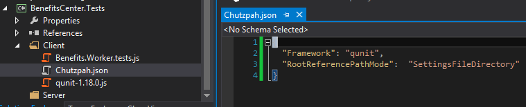 Next, add a Chutzpah.json file, which tells Chutzpah about your folder structure and chosen testing framework.