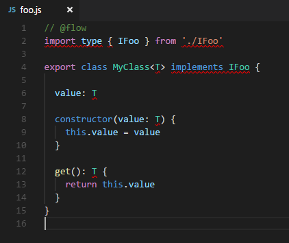 You should now have squigglies, intellisense, etc. provided from Flow.