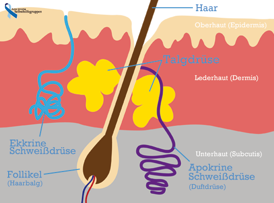 Die Erkrankung geht weder nur von den Schweißdrüsen noch nur von den Talgdrüsen aus. Beide sind erst sekundär betroffen.