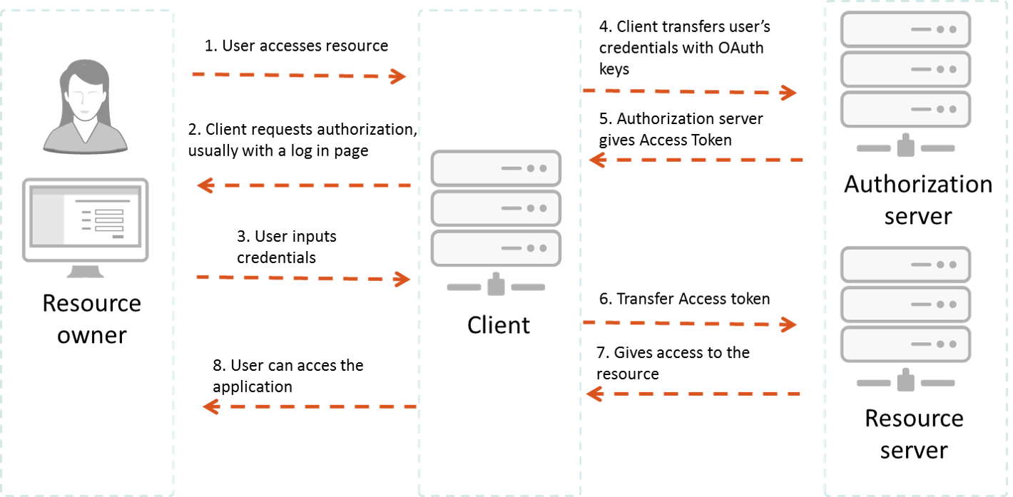 - Client: Additional application that wants to access the user account in the authorization server (resource server does not talk directly with the authorization server - security reasons)