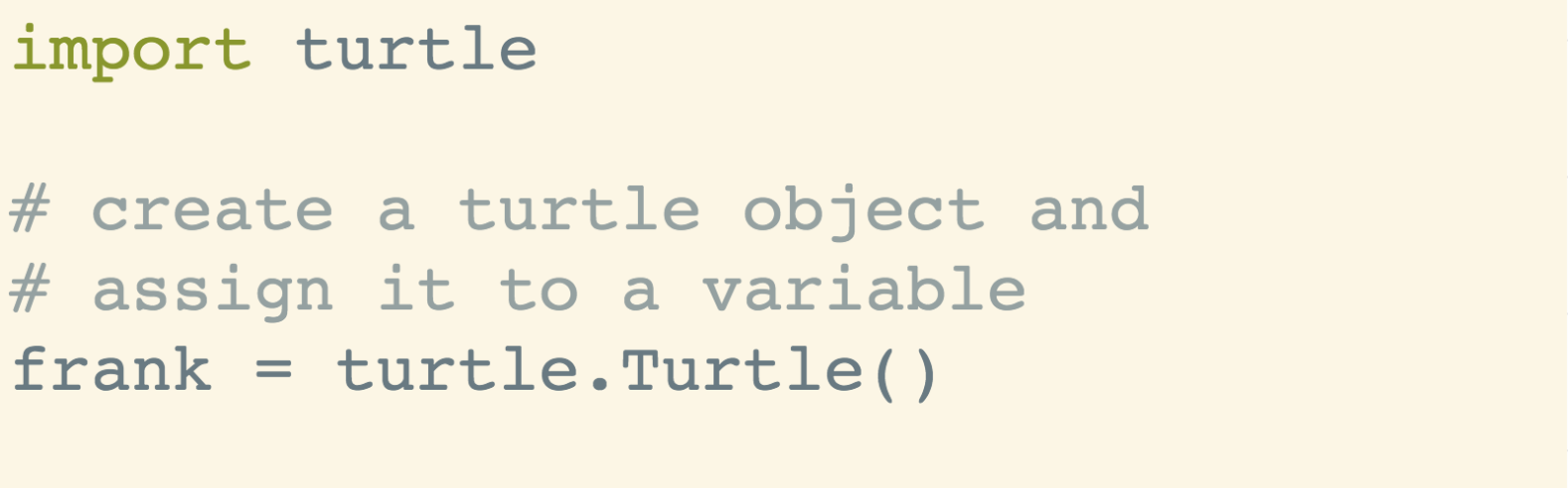 import turtleA library is a group of functions that can be added on to a language. You need to import the library into your program before you can use any of its functions.