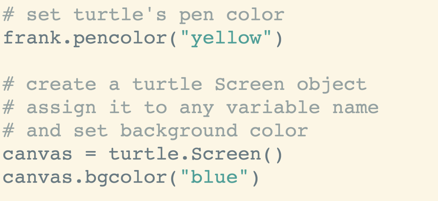 8. Use this code to change the turtle's pen color and the screen's background color. Where should this go in the sequence of your program?