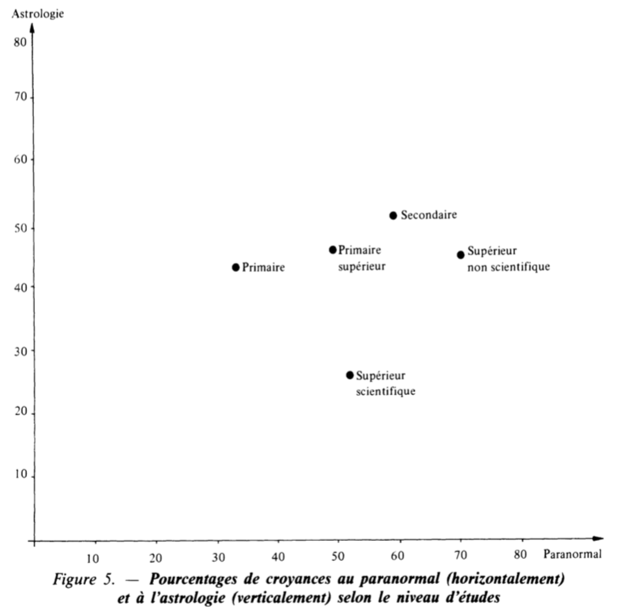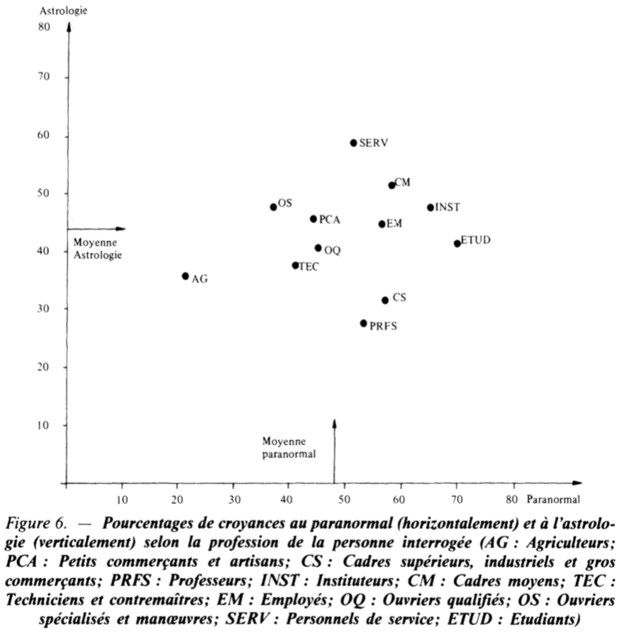Boy et Michelat (1986) : parmi les différentes catégories socioprofessionnelles de la population, les instituteur·trice·s étaient parmi les plus ouverts à certaines croyances