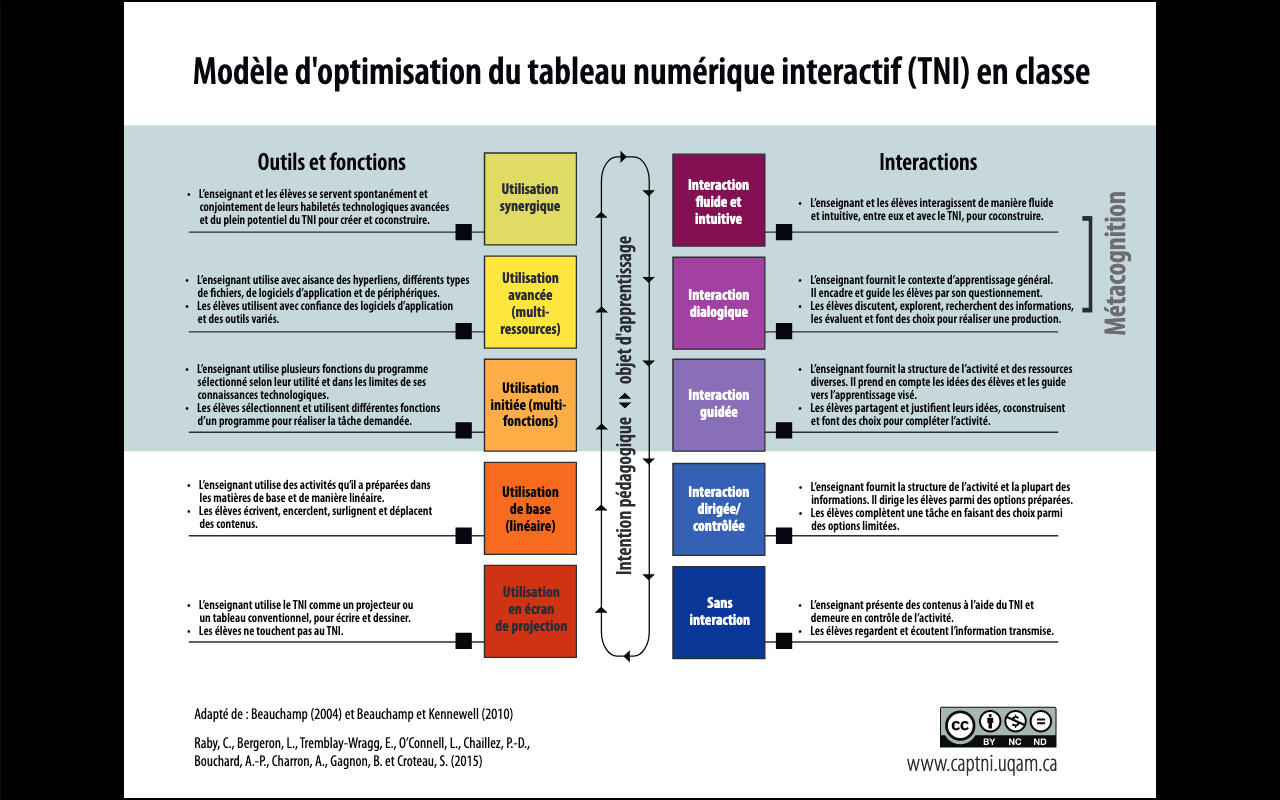 - utilisé de manière collaborative, le TNI permettrait de générer et de maintenir un espace dialogique (Mercer, Warwick, Kershner et Staarman, 2010), de favoriser la confrontation et a coconstruction des idées (Mercer, 2000) et de rendre visible le processus de réflexion (Kershner, Mercer, Warwick et Staarman, 2010) et les stratégies déployées par les pairs (Haldane, 2007) » (Raby, Bergeron, Tremblay-Wragg, Gagnon et Charron, 2015, p. 40-41)