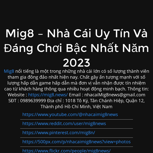 Website : https://mig8.news/ Email : nhacaiMig8news@gmail.com SĐT : 0989639999 Địa chỉ : 1018 Tô Ký, Tân Chánh Hiệp, Quận 12, Thành phố Hồ Chí Minh, Việt Nam
