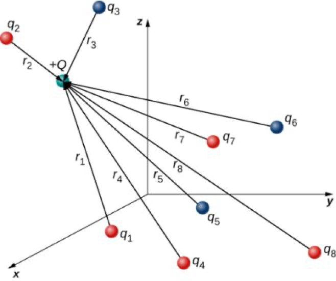 The eight source charges each apply a force on the single test charge Q. Each force can be calculated independently of the other seven forces. This is the essence of the superposition principle.