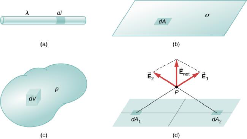 The configuration of charge differential elements for a (a) line charge, (b) sheet of charge, and (c) a volume of charge. Also note that (d) some of the components of the total electric field cancel out, with the remainder resulting in a net electric field.