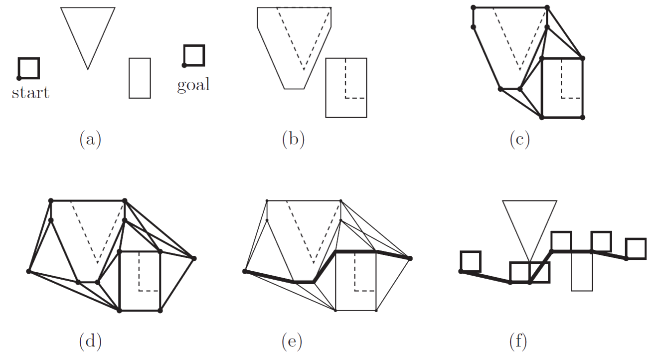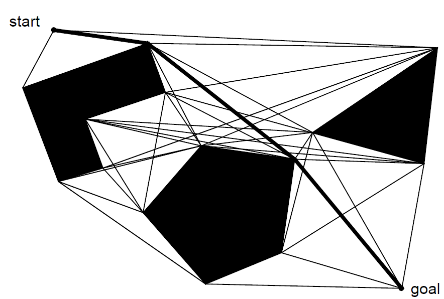 - Atajos en el recorrido: para cualquiera dos puntos en el recorrido, añada una línea directa entre ellos a menos que esta interseque un obstáculo.