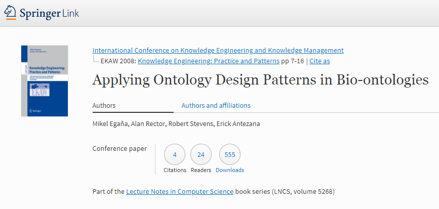 Role and application of Ontology Design Patterns in bio-ontologies. Mikel Egaña Aranguren. LAP Lambert Academic Publishing. ISBN-13: 978-3843376617, 2010