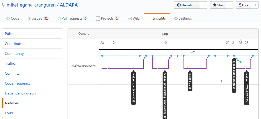 - Trabajar mediante el modelo GitFlow: rama master, rama develop, ramas feature-*, ramas release-*, ramas hotfix-*, y relaciones entre ramas