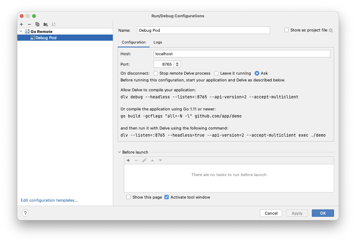 Debugging Go programs running in a Kubernetes Pod using Delve with GoLand
