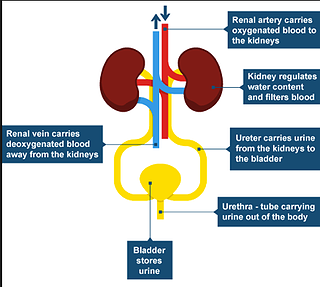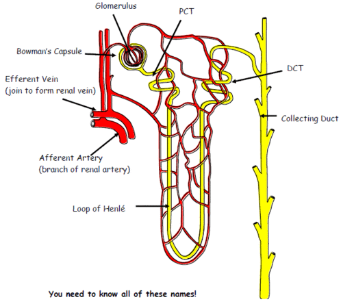 Waste products in blood carried to kidney, where they are filtered out and excreted