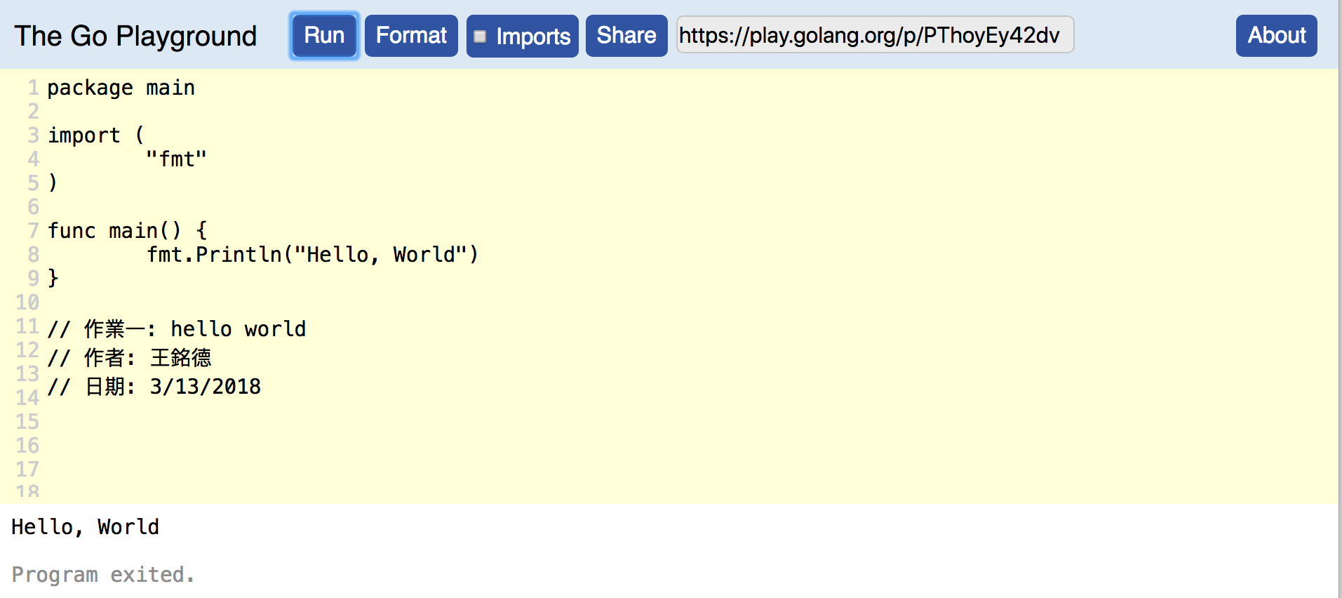 交作業方式: 將你的程式分享連結 (URL) https://play.golang.org/p/PThoyEy42dv 寄到老師的 line: mingderwang1