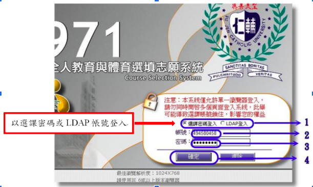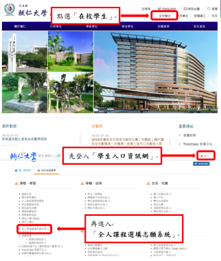 - 選課步驟:進入輔大官網→在校學生→登入後點選校內系統選單→點選全人課程選填志願系統