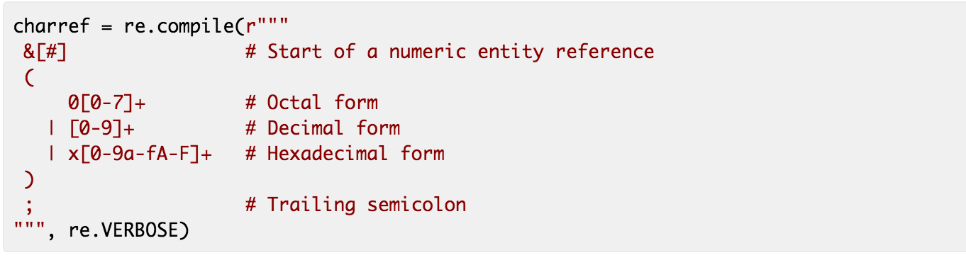 - verbose 모드를 사용할 수 있도록 한다. (정규식을 보기 편하게 만들수 있고 주석등을 사용할 수 있게된다.)