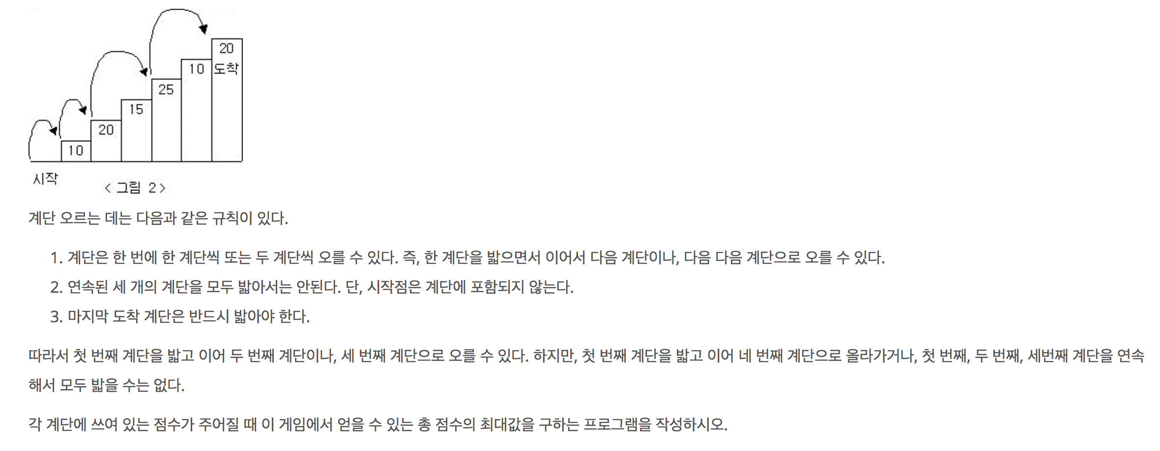 브루트 포스로 풀게 되면 O(2^계단의 개수) 수행시간에 수행되므로 시간초과가 뜨게 될 것이다.