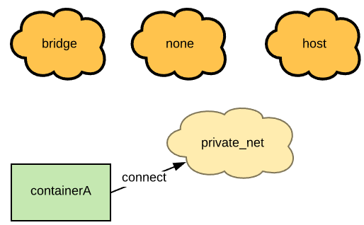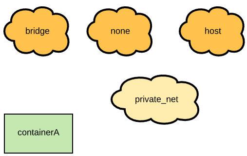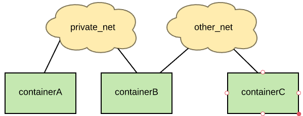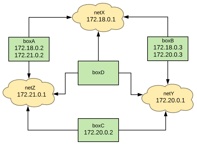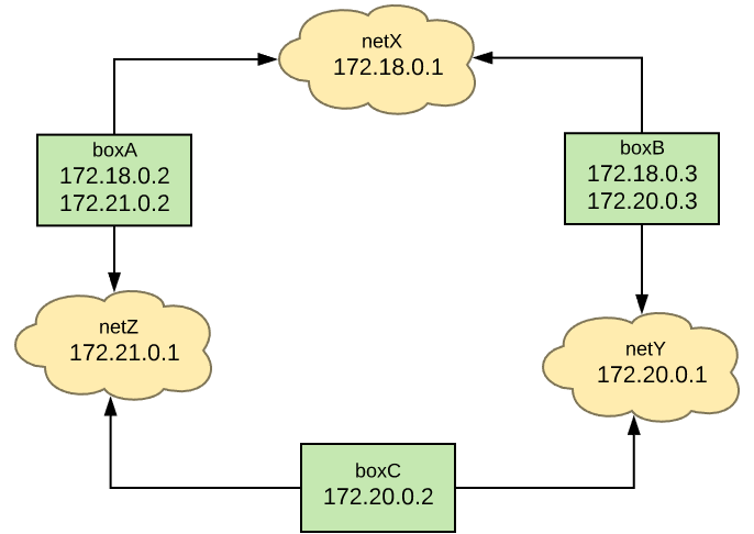 docker network create -d bridge netY docker network create -d bridge netX docker network create -d bridge netZ docker run --name=boxA -it --net=netX alpine /bin/sh docker network connect netZ boxA docker run --name=boxB -it --net=netX alpine /bin/sh docker network connect netY boxB docker run --name=boxC -it --net=netZ alpine /bin/sh docker network connect netZ boxC