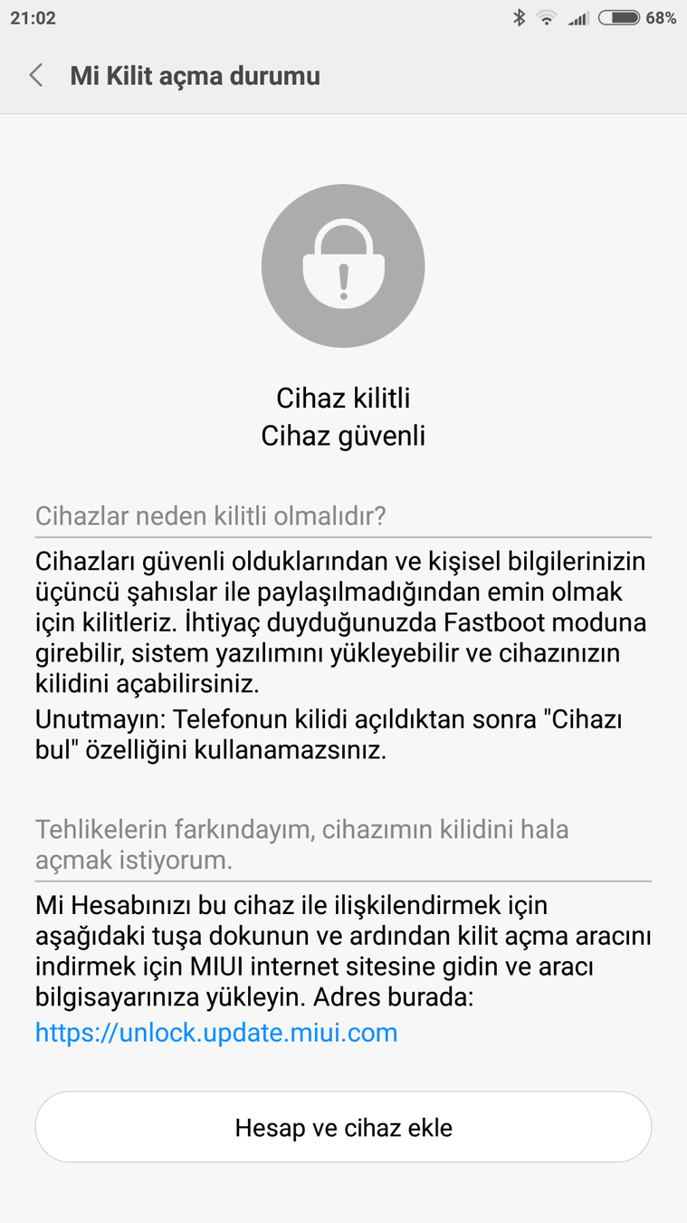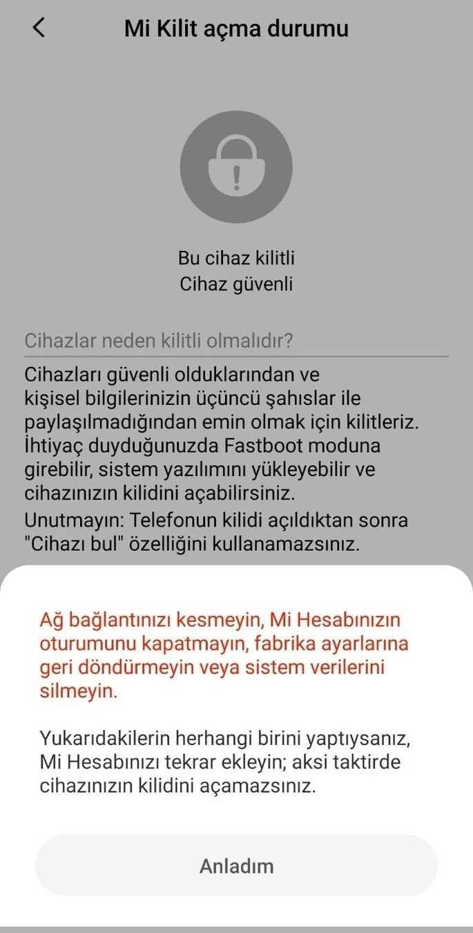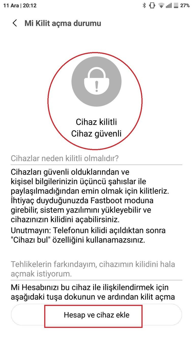 Ayarlar/Ek Ayarlar/Geliştirici Seçenekleri altında yer alan “Mi Kilit Açma Durumu” bölümüne girerek cihazınızı Mi hesabınıza ekleyin.