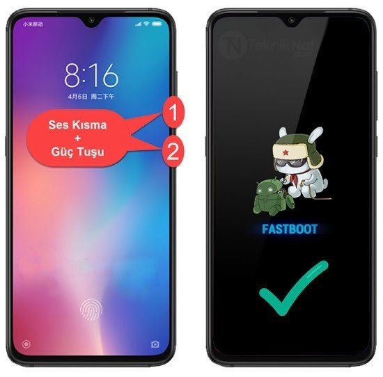 Cihazı tamamen kapatın.Cihaz kapalı iken Ses Kısma + Güç tuşunu basılı tutun taki FASTBOOT yazısı telefon ekranına gelene kadar.